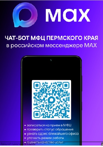 Сообщаем, что в целях повышения качества взаимодействия с гражданами при получении государственных и муниципальных услуг в ГБУ ПК «Пермский краевой МФЦ ПГМУ» (далее – МФЦ) реализован чат-бот в национальном мессенджере MAX, обеспечивающий удобное и оперативное получение информации и услуг. Чат-бот М ФЦ в мессенджере MAX предоставляет заявителям следующие возможности: запись на прием с выбором отделения, даты и времени; отмена ранее оформленной записи; получение актуальной информации об адресах и режиме работы структурных подразделений МФЦ; мониторинг статуса рассмотрения обращений в режиме реального времени; получение уведомлений о результатах предоставления государственных услуг; оценку качества и доступности услуг, включая использование системы «Ваш контроль»; заказ обратного звонка от контактного центра МФЦ
